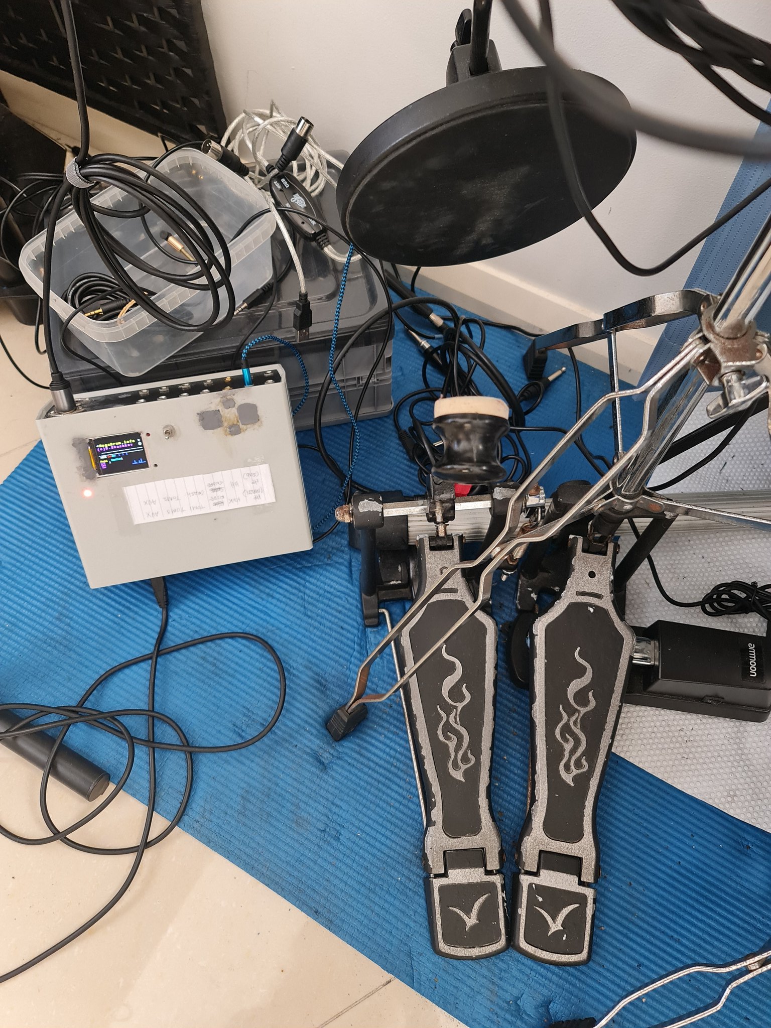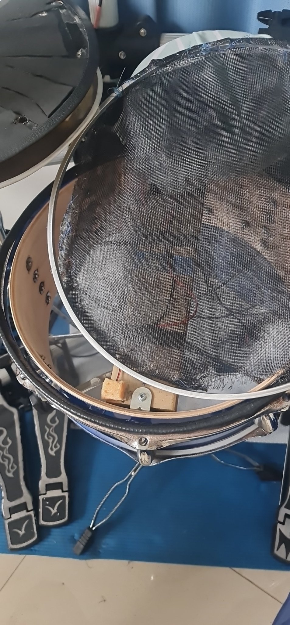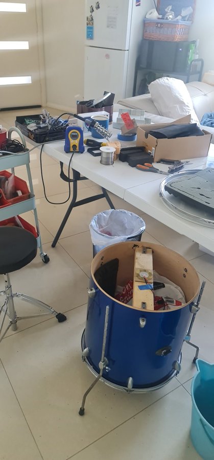 The double bass setup? I did a few fast runs and the whole pad fell off the stand. Back to the workshop. Ended up stitching the snare back together and swapping the floor tom to a mesh head while I was at it.