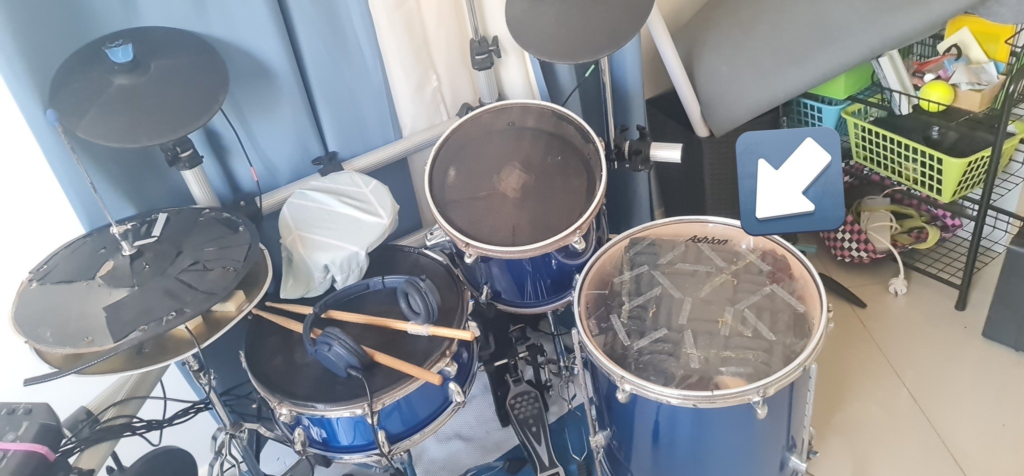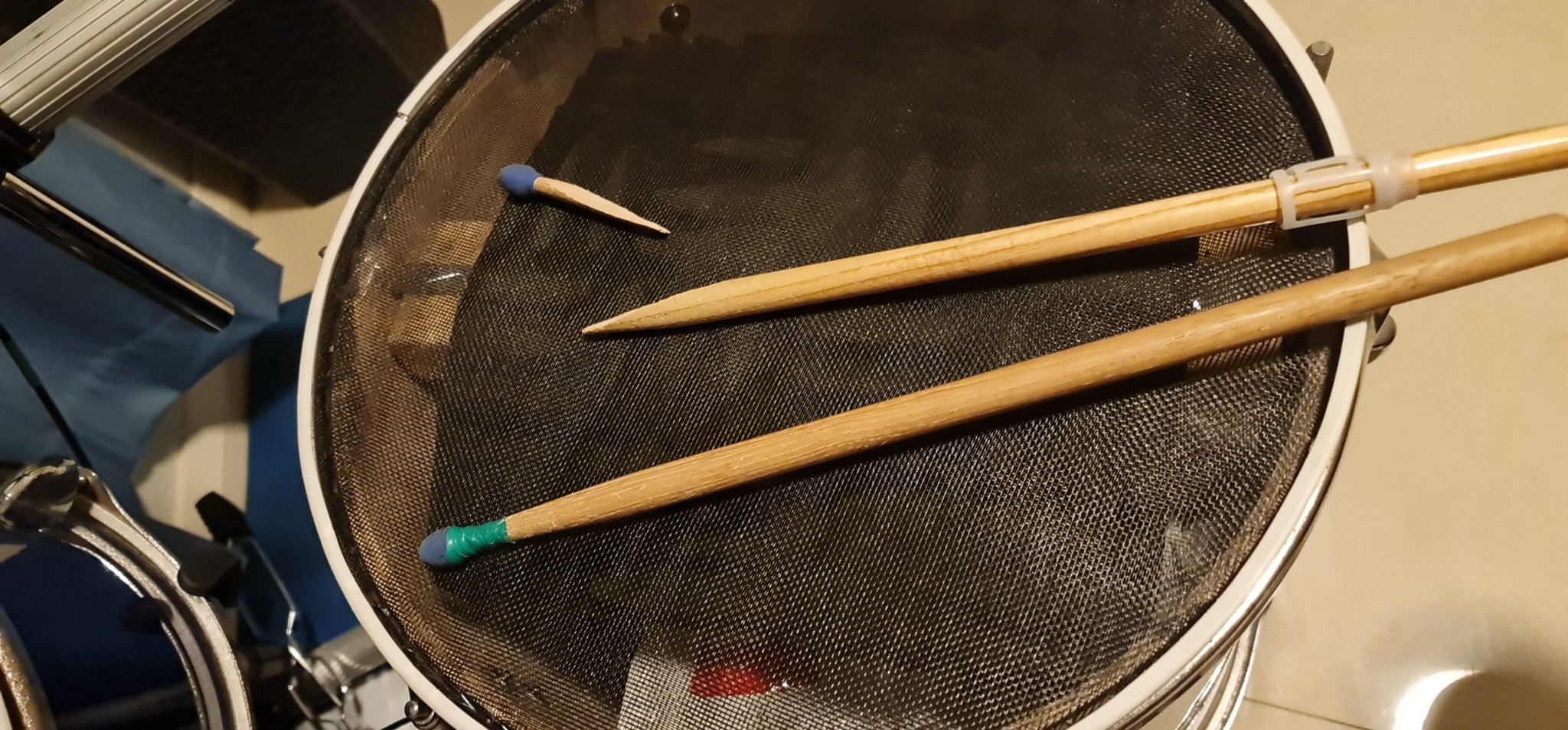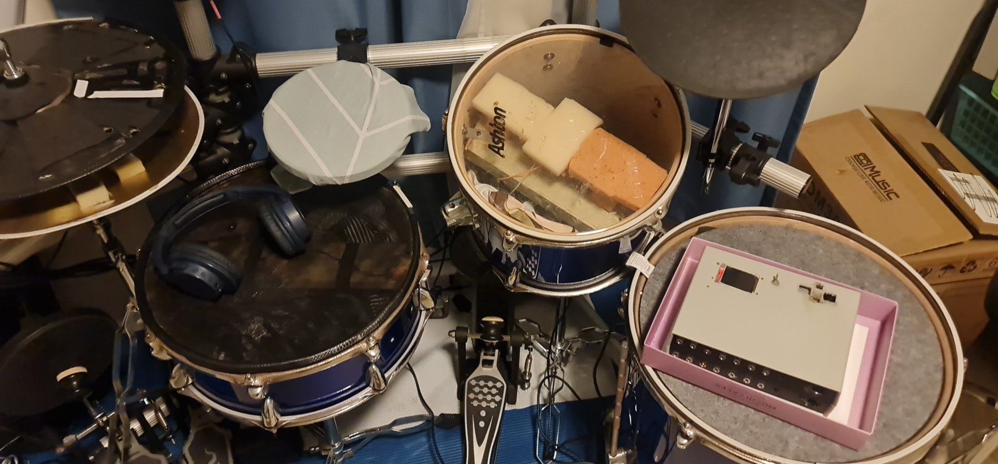 The double bass setup? I did a few fast runs and the whole pad fell off the stand. Back to the workshop. Ended up stitching the snare back together and swapping the floor tom to a mesh head while I was at it.